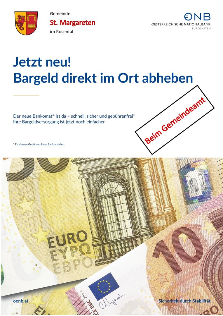 Seit Donnerstag, dem 5. Februar 2026 steht der Bevölkerung von St. Margareten im Rosental ein neuer Bankomat® der Oesterreichischen Nationalbank (OeNB) zur Verfügung. Der Geldausgabeautomat befindet sich am Gemeindeplatz, direkt beim Gemeindeamt St. Margareten, in St. Margareten 9 und ist rund um die Uhr an sieben Tagen in der Woche barrierefrei zugänglich. Damit ist die Bargeldabhebung im Ort jederzeit möglich.