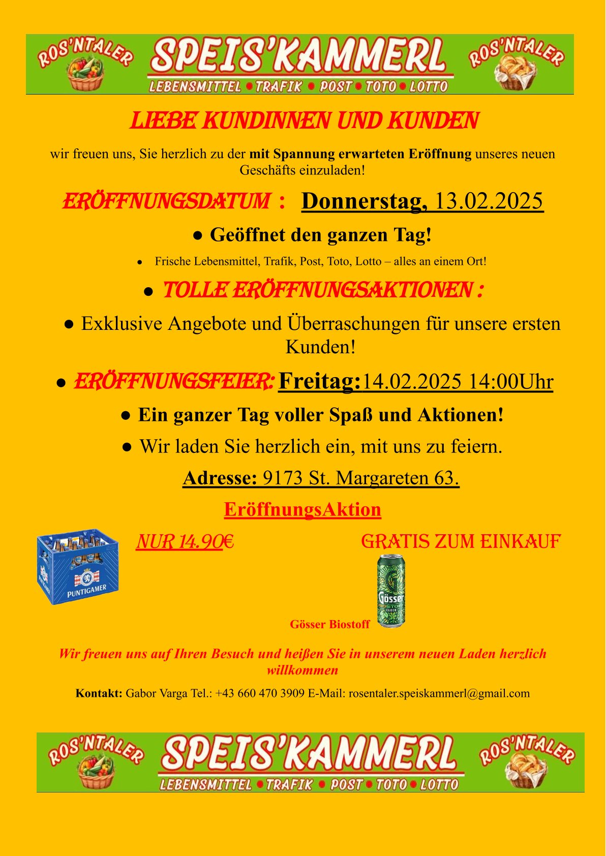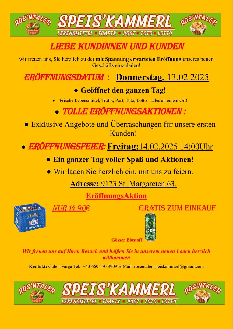 Wir wünschen Herrn Varga alles Gute für die Eröffnung und den weiteren Betrieb des neuen Nahversorgers und rufen alle Gemeindebürgerinnen und Gemeindebürger dazu auf, tägliche Erledigungen wieder in St.Margareten durchzuführen!