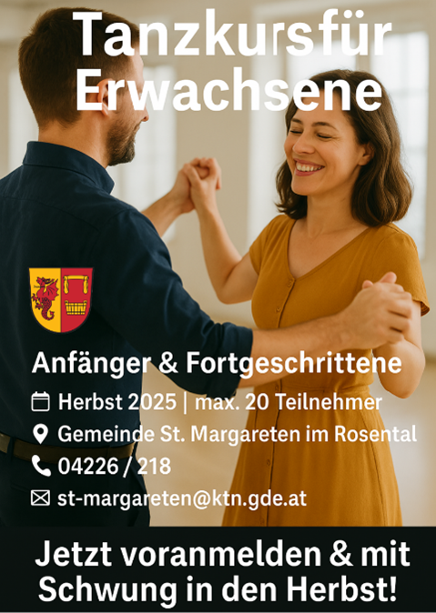 Die Gemeinde würde gerne einen Tanzkurs für Anfänger & Fortgeschrittene organisieren. Es sind 10 Tanzpaare möglich und sollte im Herbst 2025 stattfinden. Bei Interesse bitte bei der Gemeinde unter 04226/218 oder st-margareten@ktng.de.at voranmelden. Wir freuen uns über zahlreiche Anmeldungen.